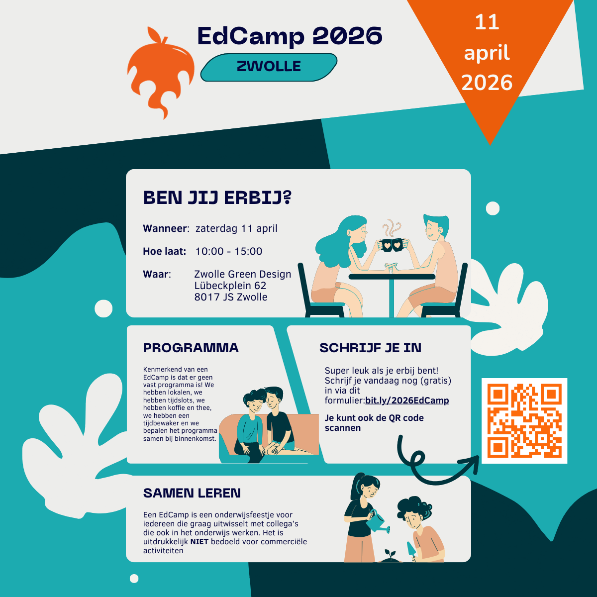 Op 11 april organiseren we samen met Rhea Flohr de EdCamp 2026 editie op het Zone.College in Zwolle. Je kunt je gratis aanmelden via deze link.Een EdCamp is een conferentie waar alles geregeld is: Locatie, lokalen, tijdslot, koffie, etc behalve het programma. Dat programma maken we samen in de ochtend tijdens de inloop. Jij bepaalt wat en wanneer je iets wilt delen door een tijdslot te claimen. Vervolgens kan iedereen kiezen waar hij/zij naartoe gaat. Je hoeft niets te delen, je mag ook gewoon alleen aansluiten bij andere sessies of lekker bijpraten met collega's uit het land. Voel je uitgenodigd om te komen. Neem wel je eigen lunch mee. Lees er meer over in deze afbeelding 👇